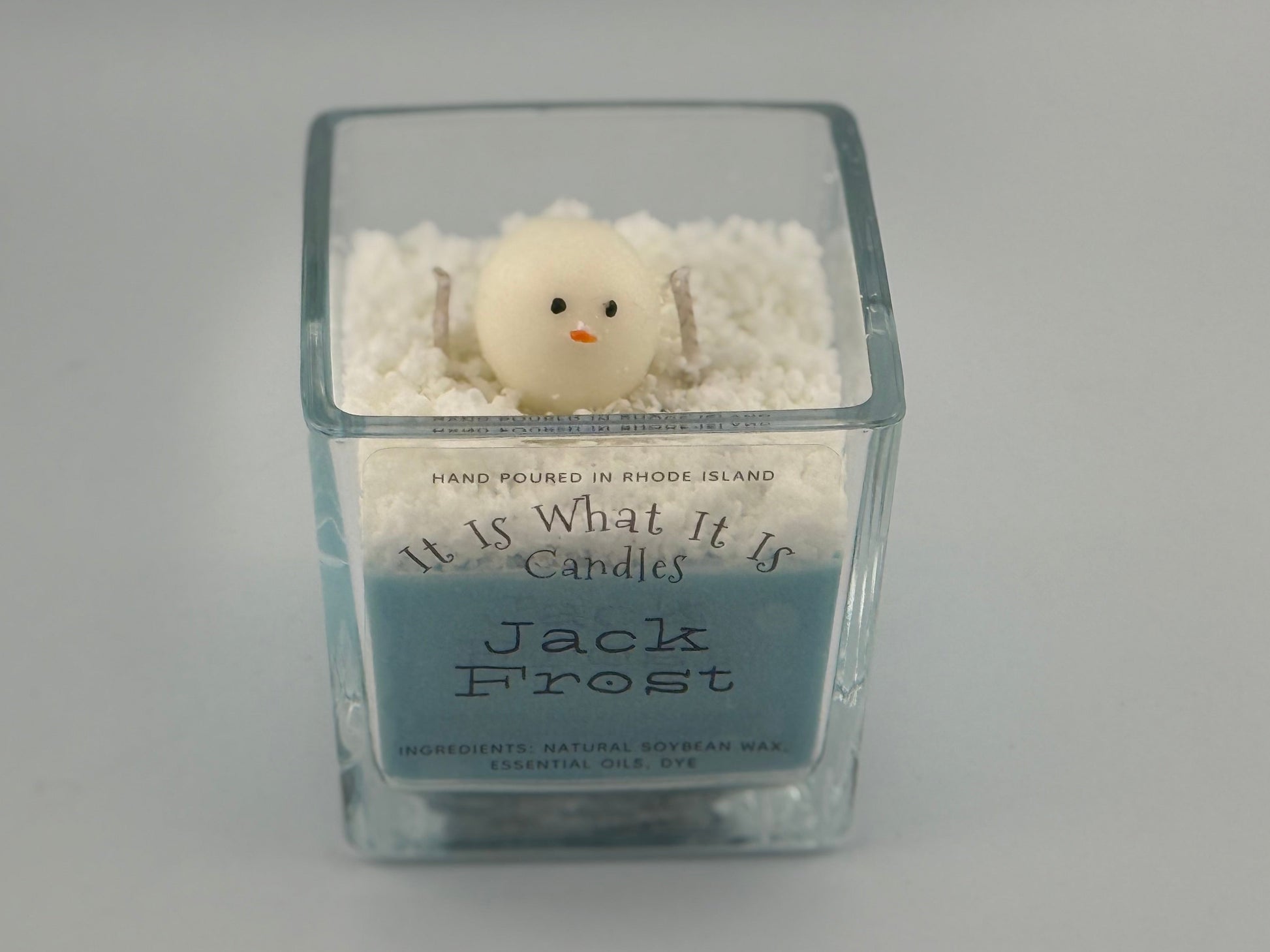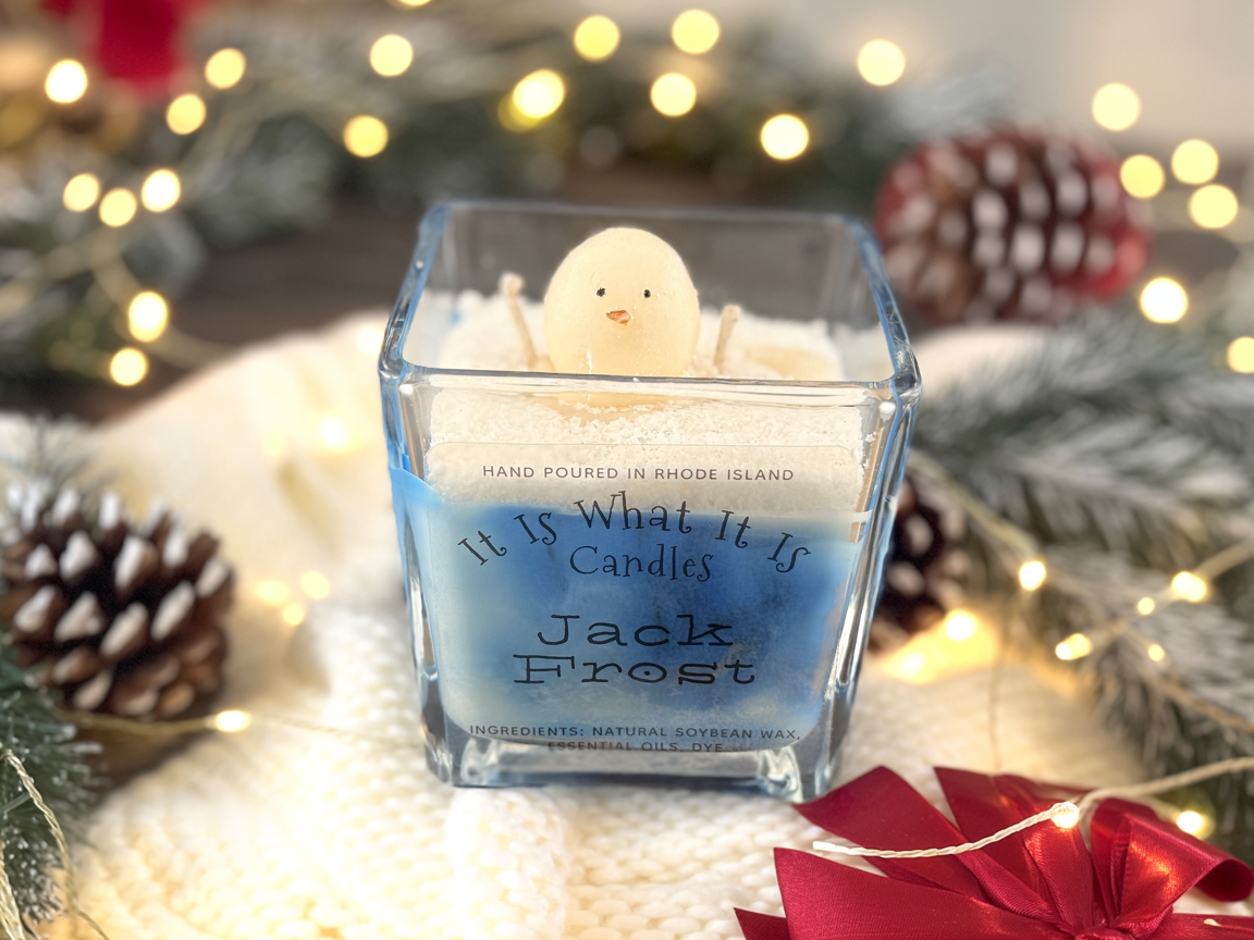 As you light the wick, allow the delightful aroma to transport you to a serene snowy landscape, where the magic of the holidays comes alive. Perfect for holiday gatherings, cozy evenings by the fire, or simply to infuse your home with a cheerful winter spirit, our Jack Frost Candle adds a touch of festive charm to any occasion.
